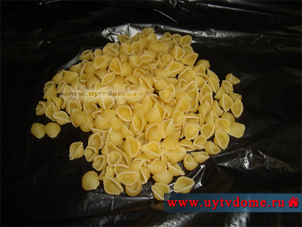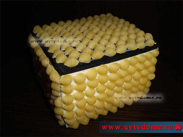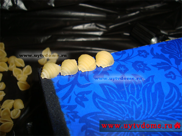 ► Высыпаем макароны на ровную поверхность, и приступаем к приклеиванию к поверхности шкатулки. Клей можно наносить на каждую «ракушку» или сразу на небольшой участок изделия и уже к нему приклеивать макароны. Второй вариант позволяет гораздо быстрее провести необходимую работу. Когда шкатулка будет полностью со всех сторон покрыта «ракушками», оставляем изделие на пару часиков в покое, для полной просушки клея.