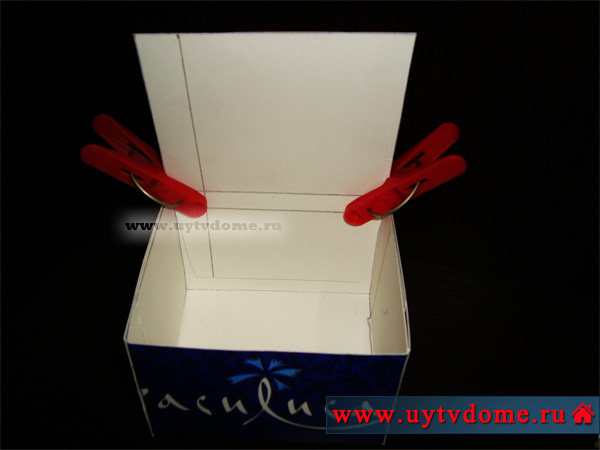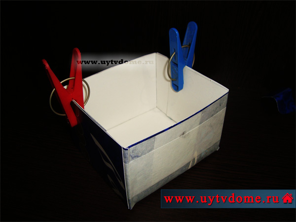 ► Складываем шкатулку в единое целое, проклеиваем стенки клеем. Чтобы клей лучше схватился, по краям прижимаем проклеенные части прищепками.