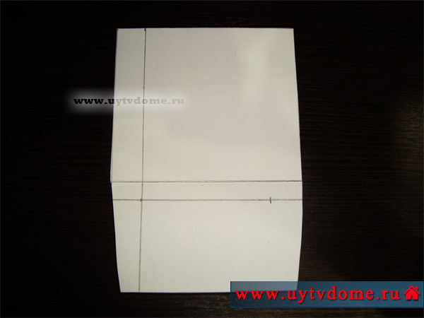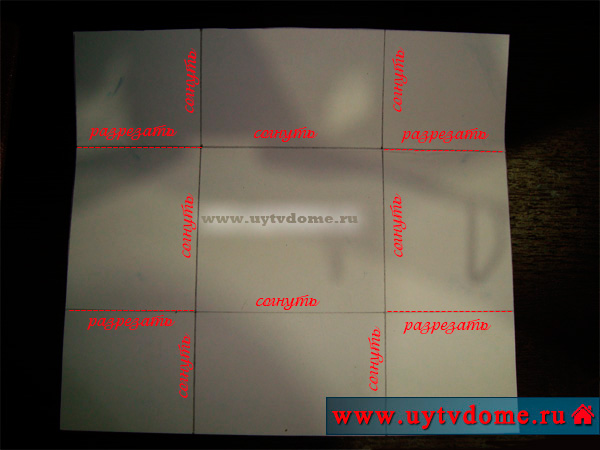 ► На листе картона чертим линии, как на фото ниже, можете для начала потренироваться на клетчатом листе, создав нужный по ширине и высоте шаблон. По отмеченным красным цветом линиям создаем надрезы (см. фото). Там где написано «согнуть» — сгибаем.