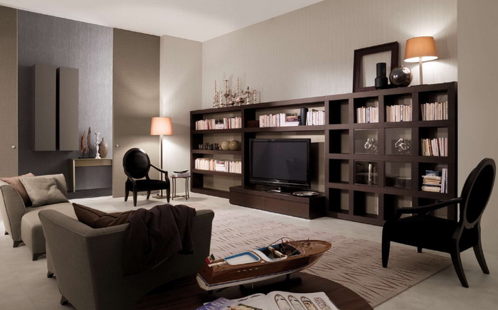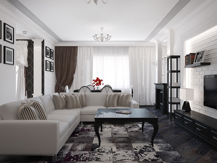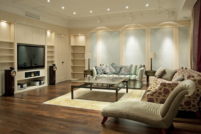 • Если гостиная не очень большая, то мебель лучше размещать вдоль стен и в углах. Если в комнате есть камин, то телевизор стоит расположить напротив него. При этом следует помнить о достаточном количестве места для проходов.