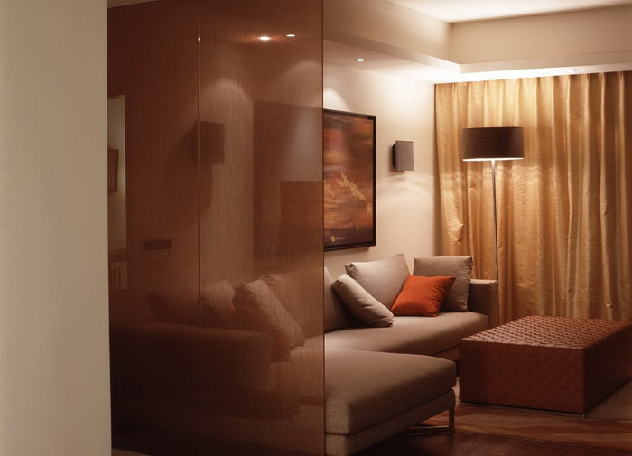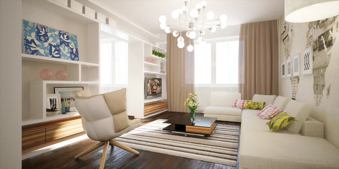 • Можно использовать разнообразные детали для того, чтобы сформировать многофункциональное пространство гостиной комнаты. Это может быть текстиль, который используется в отделке окон. Он же может дублироваться при оформлении стен, мебели, ковров и прочего.