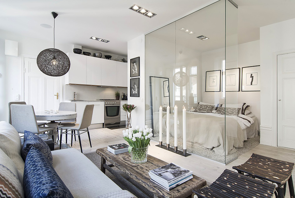 Очень смелое решение – объединить спальню с ванной комнатой в крохотной квартире. Но насколько это красиво и оригинально, а еще и функционально! Такой прием позволяет в однокомнатной квартире обустроить кухню-столовую и спальню-ванную, где каждому члену семьи найдется место для полноценного отдыха или активного времяпровождения. Это далеко не бюджетный вариант перестройки, как все новое и креативное.