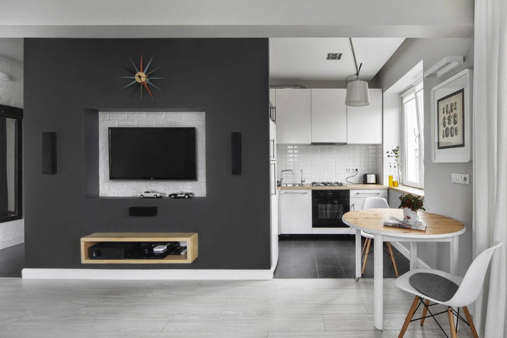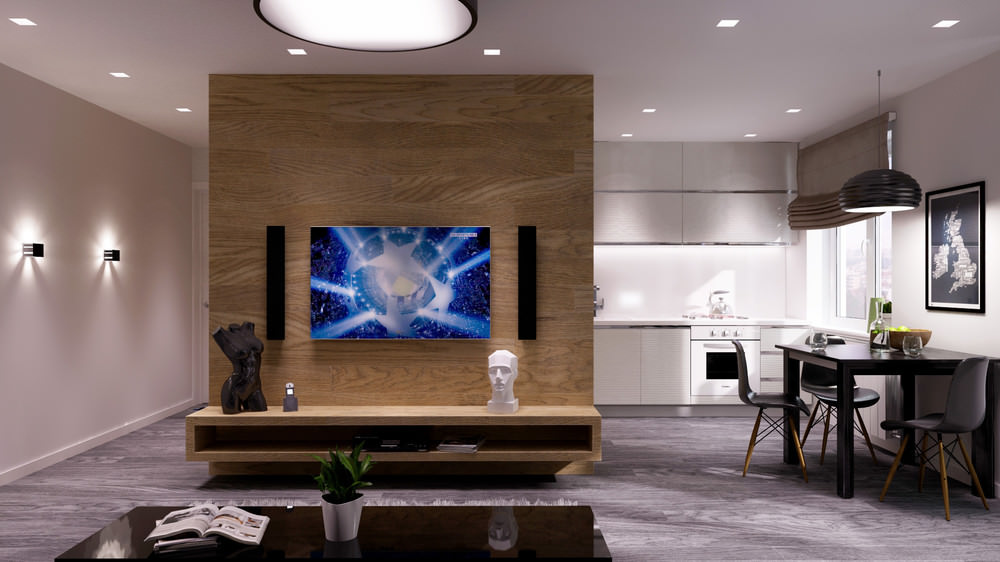 В данном серо-белом интерьере искусственно созданная перегородка скрывает за собой часть кухни и санузел, дверь в который находится слева от входа в квартиру. Кроме этого перегородка выполняет функцию стенда для крепления телевизора и ниши для прочей техники. Нейтральные цвета помогают еще более органично объединить разные по назначению пространства в одно.