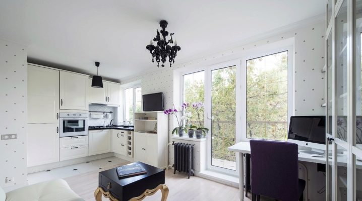 Хрущевка превращена в студию, которая объединяет пространство кухни и гостиной в единую полезную площадь. Здесь есть полноценная кухня, обеденная зона и зона отдыха, большой диван, в которой выполняет роль спального места. За счет светлых оттенков пола и стен достигается эффект расширения пространства. Объединение помещений и снесение стен – основной прием, за счет которого решается задача недостатка площади. Здесь важно отвоевать каждый сантиметр, чтобы превратить его в свободу и свет.