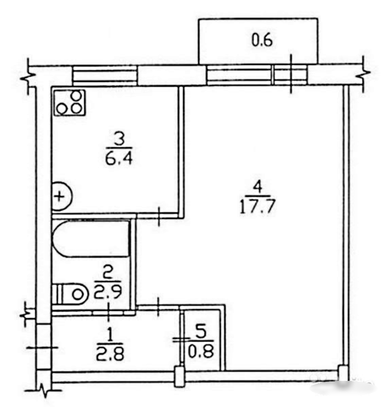 В таких квартирах чаще всего имеется совмещенный санузел, кухня площадью 5-6 м2 и большая гостиная площадью 18-20 м2. Остальные 5 м2 заняты прихожей, кладовкой и балконом. На плане это выглядит так.