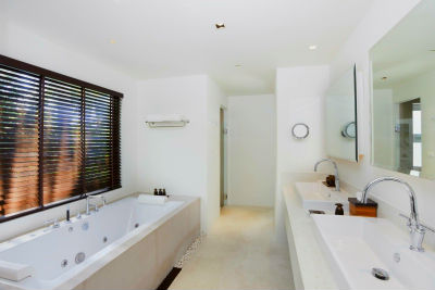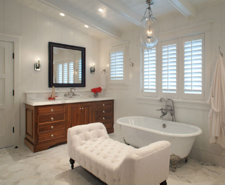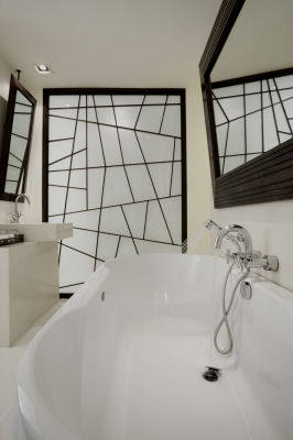 Так же особое внимание, следует уделить дополняющим аксессуарам: белым полотенцам, вазам, картинам, шторам. Кстати, даже если в ванной комнате не предусмотрены окна, помещение, благодаря кипельному цвету и правильно подобранному искусственному освещению, будет смотреться светло и уютно, как будто его наполняют веселые солнечные лучики. Ванная в белых тонах будет смотреться еще гораздо более уютно, если на полу расположить небольшой круглый или овальный коврик с геометрическим орнаментом.
