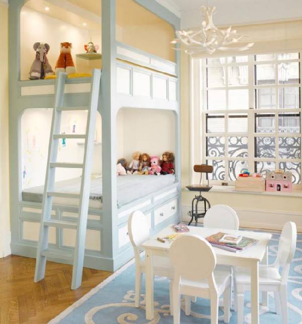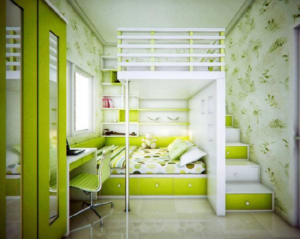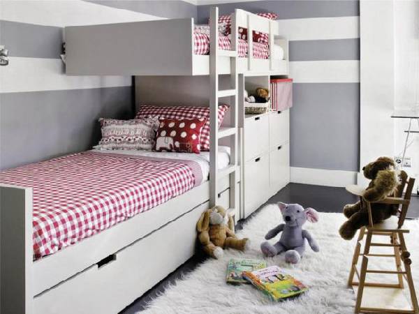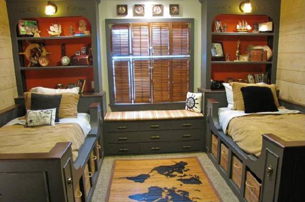 Что касается кровати, то здесь опять же уместно будет выбрать двухэтажную модель. Причем важно позаботиться о том, чтобы она была оснащена различными полками и ящиками для хранения вещей.