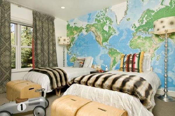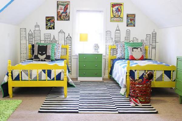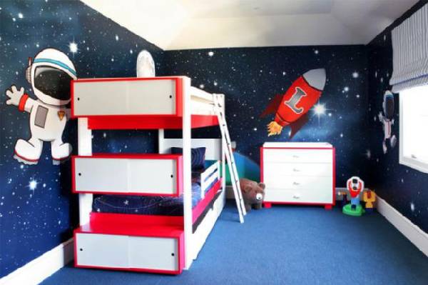 Продолжая тему оформления интерьера детской комнаты для 2 детей, хотелось бы поговорить о комнате для мальчиков. Естественно, и здесь нужно учитывать возраст детей. Так до 9 лет мальчишки будут в восторге от таких стилей, как морской, космический, пиратский, авиационный и конечно же, автомобильный. Также хорошая идея оформлять комнату с изображением супергероев, животных, роботов и т. д. Главное, чтобы выбранный вариант нравился обоим братьям.