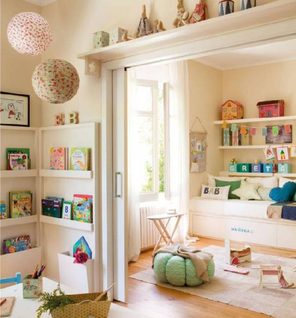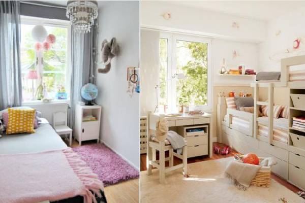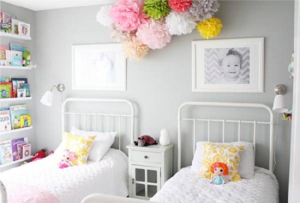 Ещё один полезный совет: персонализируйте кровати каждой девочки. Так, над каждой кроватью можно повесить фотографию маленькой хозяйки или табличку с именем. Не помешает также и оставить возле кровати красивые полки, на которых разложены любимые вещи каждой девочки.