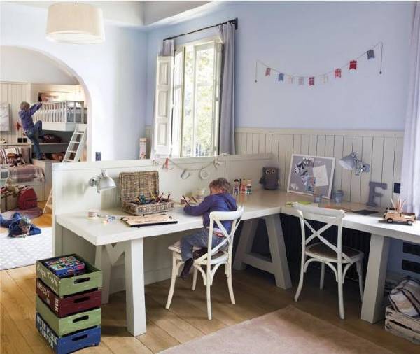 Продумывая зону для учебы в интерьере детской для двух мальчиков, можно остановить свой выбор на длинном либо большом столе. Так, оба мальчика будут иметь достаточно места за столом, что безусловно является плюсом. Если позволяет площадь, лучше поставить отдельные учебные столы для каждого мальчика (так у каждого появится свое личное пространство). Если же места мало, как вариант, можно использовать раздвижной стол и собирать его при ненадобности. Что на самом деле важно за учебным столом, так это хорошее освещение для каждого ребенка.