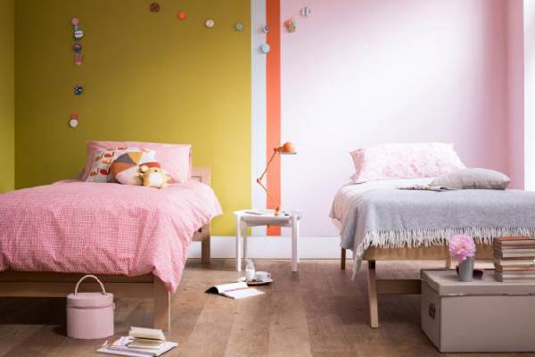 Можно оформить стены комнаты двумя разными цветами, как на этом фото. Так вы разграничите комнату на зоны для каждой сестры. Дети будут только рады этому обстоятельству.