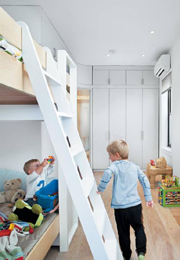 Вот еще один интересный вариант интерьера маленькой детской комнаты для двоих детей. Здесь два спальных места размещены совсем рядом на первом этаже, а над ними располагается игровая зона, на которую можно забраться при помощи лестницы. От такого дизайна детской малыши будут просто в восторге. А главное — есть место для каждого ребенка и в маленькой комнате помещается все необходимое.