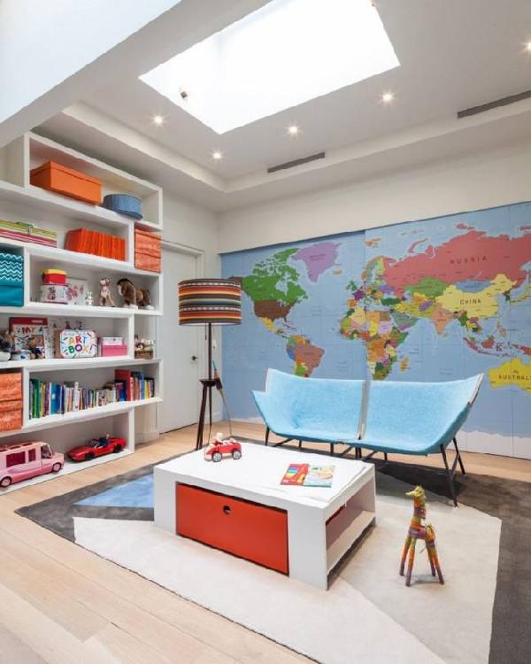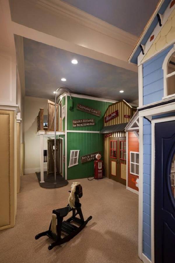 Можно даже оформить комнату в стиле города, с настоящими дверями, домами и потолком, имитирующим небо.