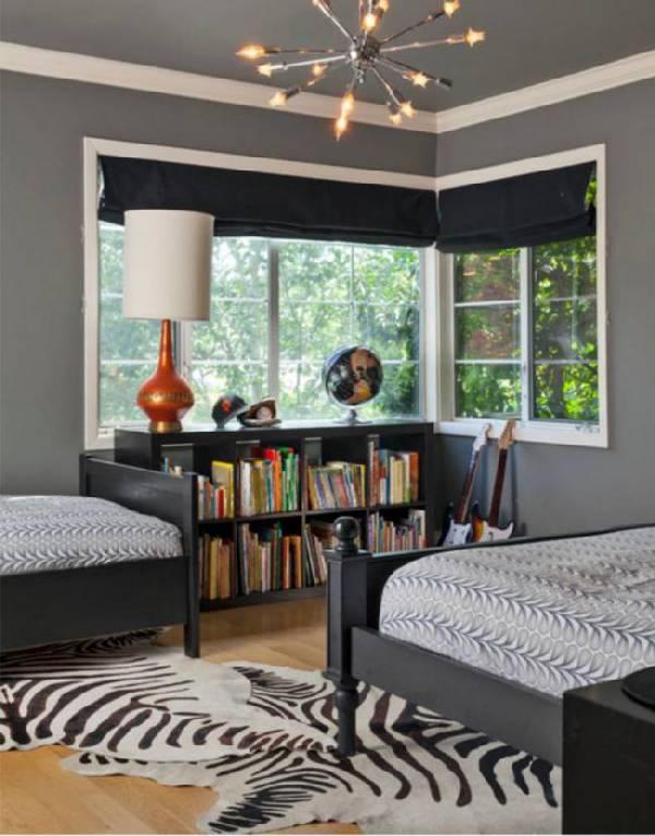 Если дети разного возраста, то зонирование комнаты — вещь необходимая. Идеально для этого подойдут шторы, перегородки или даже книжный шкаф.