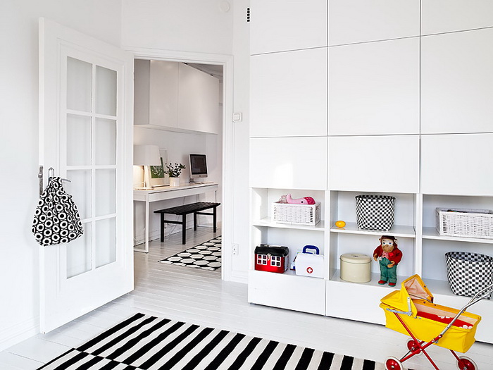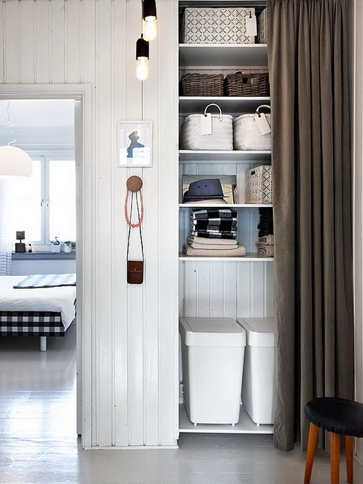 Встроенные шкафы, окрашенные в тон стен, неприметные, легкие, зато полезные.