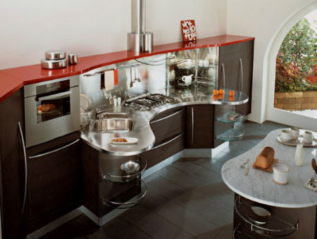 Коричневая мебель может быть дополнена бронзовыми элементами или стеклянными витражами. Прекрасно будет смотреться кухонный гарнитур не с острыми углами, а с закругленными, тем более плавные линии в дизайне мебели сейчас на пике популярности.