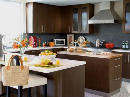 Но целиком кухонное пространство в коричневом цвете оформлять, конечно же, нельзя. В данном цвете лучше приобрести мебель, а вот стены, пол и потолок следует разбавить более светлым, пастельным тоном. Кроме того коричневый будет отлично смотреться с нежно-зеленым цветом, бледно-оранжевым, ярким желтым и конечно же белым. Последний, в оформлении коричневой кухни является настоящим фаворитом, настолько выгодно он может оттенить мебель от стен. А лично мне, очень нравится кухня в коричневом цвете, дополненная обычным бежевым цветом.