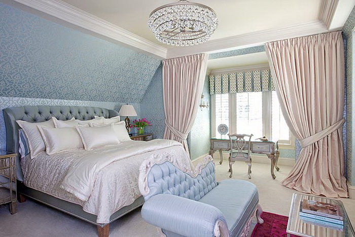 Бежевые, голубые, серые, пепельно-розовые цвета, использованные для оформления комнаты, хорошо сочетаются между собой.