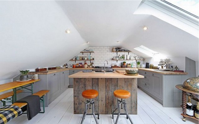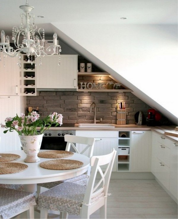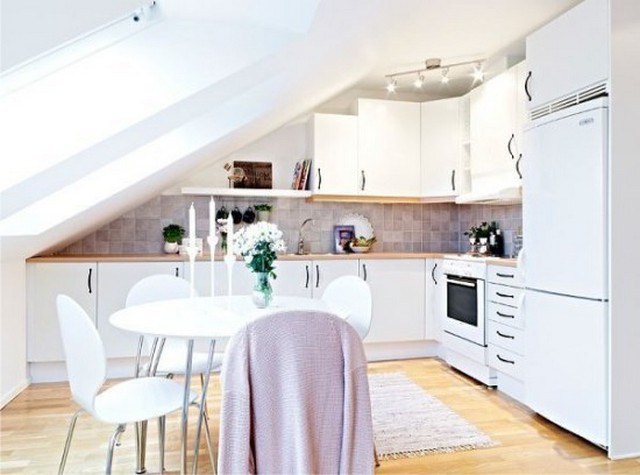 Скошенный потолок с открывным окном — главная характеристика кухни с мансардой. Ещё такое помещение может казаться тесноватым, а это значит, что светлые тона — лучший выбор в данном случае.
