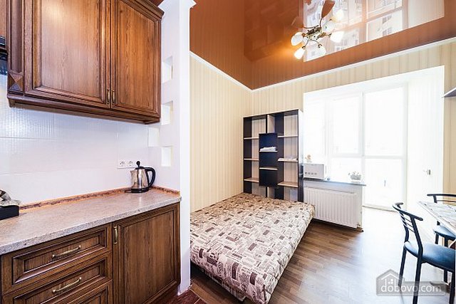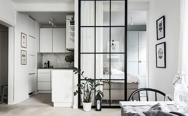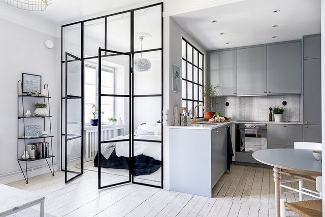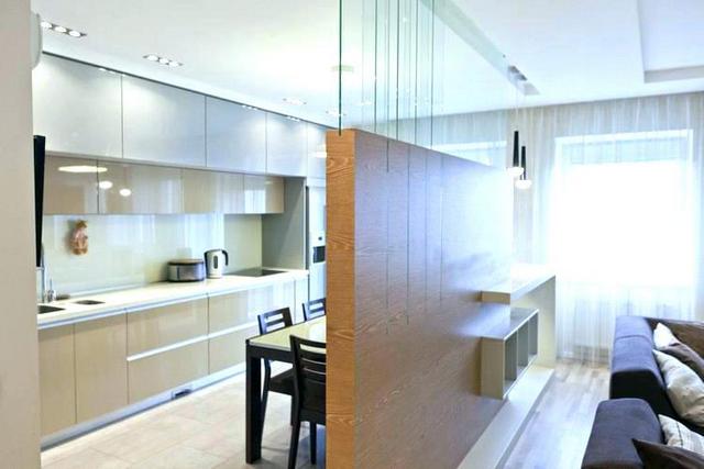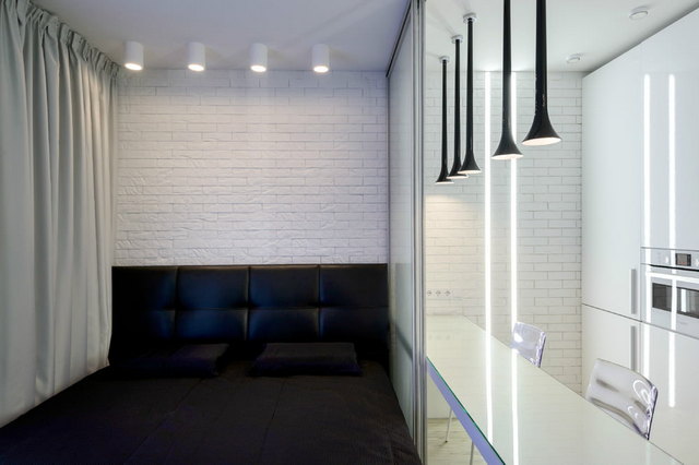 • Кухню спальню может разделять фальшстена, но тогда вы украдёте у себя чуть-чуть пространства.