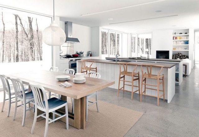 Панорамные окна всегда предполагают обилие дневного освещения. Утяжелять интерьер яркими цветными или массивными тёмными деталями не стоит. Помните, мы исходим из того, что у нас есть, а значит, интерьер кухни студии в таком доме должен быть лёгким и светлым.