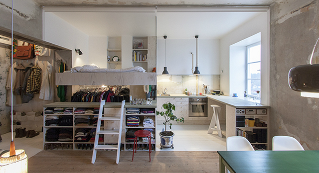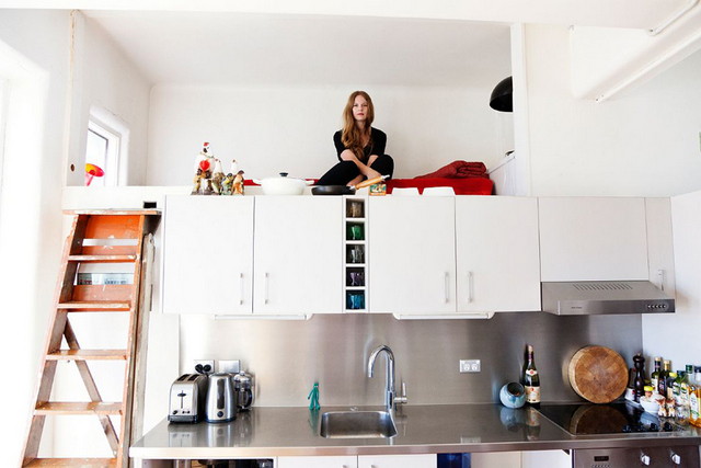 • А, при наличии высоких потолков, можно вообще оборудовать спальное место над кухней! (не забываем про мощную вытяжку)