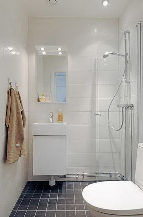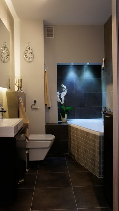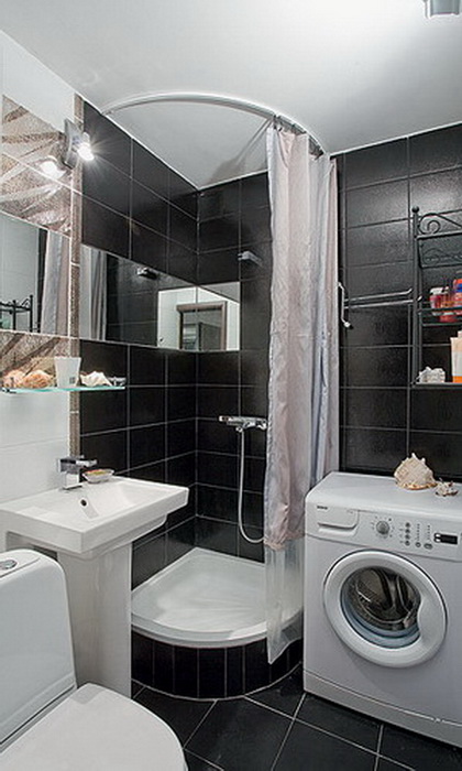 Маленькие ванные комнаты, словно драгоценные шкатулки, в которых размещается всё самое ценное, самое нужное. Они одинаковы по функционалу, но разнообразие материалов и наполнение говорит само за себя. Есть простые — без изысков, а есть с претензией, как эта в чёрном, с зеркалом в необыкновенной раме. Весёленькие (оранжево-зелёные со стеклянной раковиной), красные с узором, красные в клеточку, белые, строгие, чёрно-белые – всех объединяет одно – размер. В маленьких квартирах маленькие ванные превращаются в драгоценные оригинальные коробочки.
