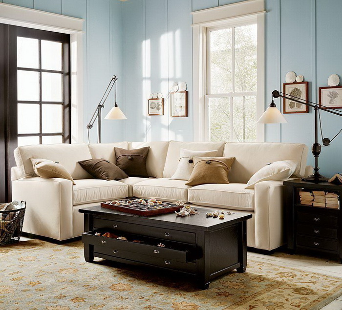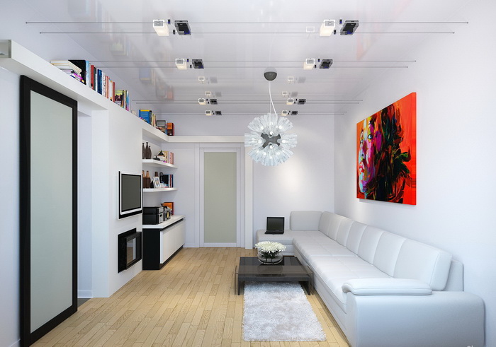 Не стоит загромождать гостиную мебелью. Если будет стоять диван, то он обязательно должен иметь отсек для хранения белья и вещей. Избегать надо, слишком массивных форм, тяжелых ножек и крупных подлокотников. Подойдут диваны светлых оттенков, однотонные или без крупных рисунков, небольших размеров.