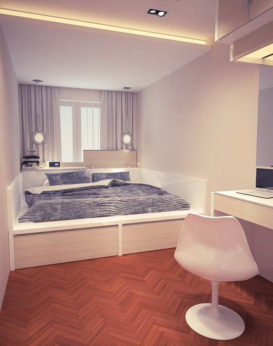 Часто для маленькой спальни выбирают стиль – минимализм. Этот стиль предполагает использование белого цвета и минимального количества мебели. В результате свободного места становится больше, комната выглядит воздушной и просторной.