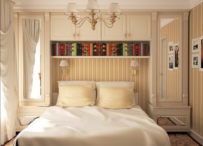 Интерьер маленькой спальни должен быть лаконичным. Не стоит заставлять комнату, лишней мебелью. Громоздкие полки и массивные стулья, занимают много места. Их можно разместить в другой комнате. Для хранения книг, подойдет один многоярусный стеллаж.