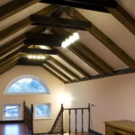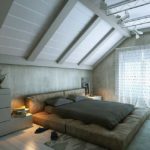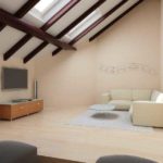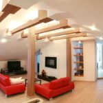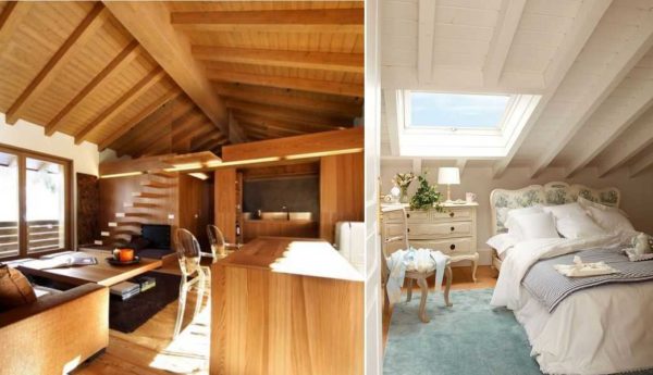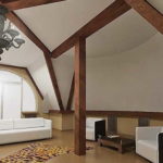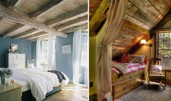 Некоторые видимые несущие конструкции считают недостатком, который мешает сделать стандартный дизайн. Но стоит на «недостатке» сделать акцент, как он превращается в интересное дизайнерское решение. Если говорить о стилистике, то мансарда с балками выглядит намного «интереснее». Пространство между ними можно зашить доской, затянуть натяжными или закрыть подвесными потолками. С любым типом отделки они сочетаются. Надо будет только подобрать цветовое решение, которое подходит к общему дизайну мансардного этажа или конкретного помещения.
