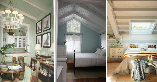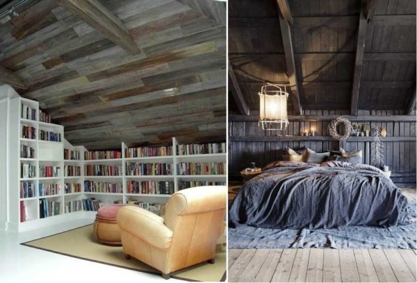 Потолки на мансарде можно отделать и необычными материалами. Важно не забывать о том, что конструкция может давать усадку. Поэтому отделка должна быть эластичной, либо, если она жесткая, ее монтаж должен оставлять возможность слегка двигаться. Вот еще чем можно оформить потолок на мансардном этаже: