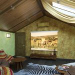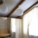 - Ткани. Затянуть промежутки между балками можно плотными тканями. И необязательно это должны быть гобелены или их современные аналоги. Экспериментируйте — может получиться интересно.