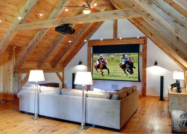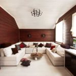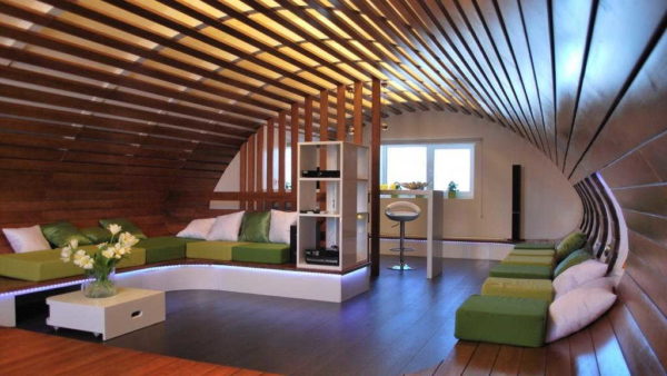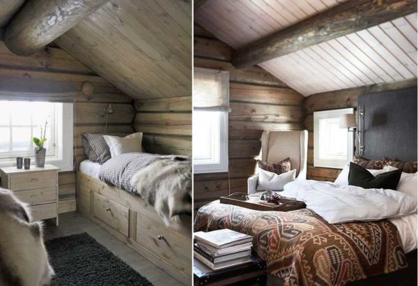 Есть еще один стиль, который можно реализовать на мансардном этаже с потолком отделанным деревом — русский. Но в этом случае для отделки придется выбрать имитацию бревна или бруса. Соответственно, потребуется подбирать и другие компоненты интерьера. Тут все несложно. Вот только не рекомендуем покрывать древесину лаком или другими составами с желтыми оттенками. Очень уж быстро они набивают оскомину, хотя, поначалу, «греют» и создают солнечное настроение.