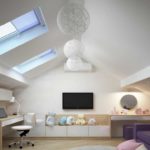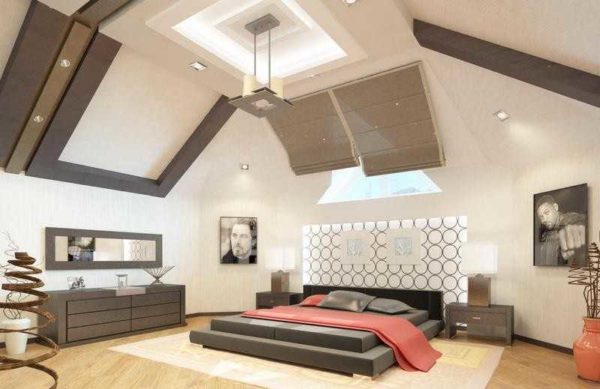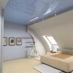 Если говорить о дизайне, то громоздкие многоуровневые конструкции тут не пойдут, разве что вся мансарда у вас без перегородок и высота помещения в районе трех метров. Само строение потолка мансардного этажа — ломанная. Усложнять ее дополнительными элементами вряд ли стоит, разве что сделать короб с подсветкой с дальней от окна стороны.