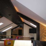 Один из самых сложных вопросов — отделка потока в мансарде. Потолок в таких помещениях либо наклонный, либо ломаный. Оба варианта не слишком просты для отделки. В принципе, можно использовать любой материал, которым отделывают потолки в обычных помещениях, но монтаж должен учитывать возможность смещения несущих конструкций. Балки делают из древесины, а она изменяется в размерах при изменении температуры/влажности, так что жесткое крепление каркасов или отделочных материалов грозит возникновением трещин.