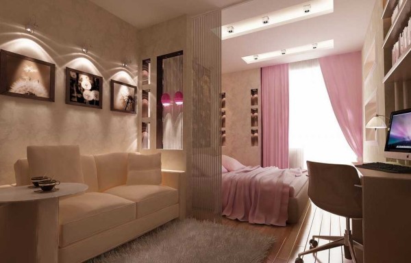 Света должно быть много, и он должен быть зонированным. Это значит, что кроме общего освещения на потолке, очень неплохо было бы установить светильники над кроватью, в рабоче зоне, возле дивана и т.п. Как правило, верхним светом тогда пользуются редко, чаще включают местное освещение. Так уютнее, создается впечатление большого пространства — вы в освещенном круге, а за ним полутьма и стен почти и не видно, особенно если они светлые.