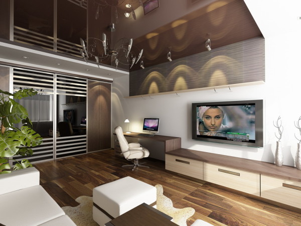 Дизайн однокомнатной квартиры в бежево-коричневых тонах. Удачно сделанный потолок, пуст и темного цвета, зрительно делает помещение просторным