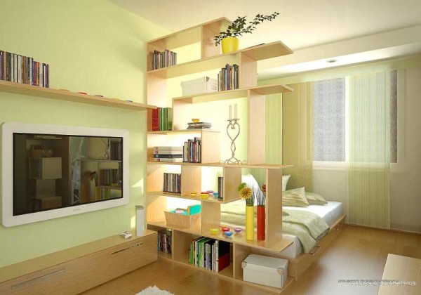 Одна из вариаций этого способа — установка мебели, прикрывающей кровать. Это может быть книжный стеллаж, полка и т.п.