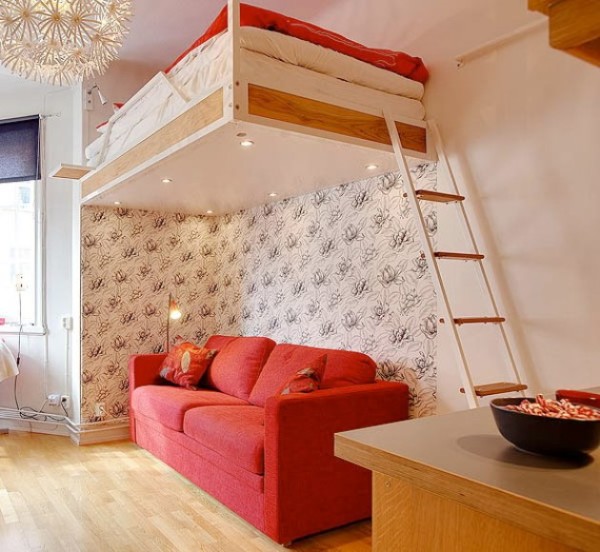 Если площадь совсем маленькая, но потолки высокие (хотя-бы 2,7 м) чтобы не делить маленькое помещение кровать можно вынести «на второй этаж». Два варианта — на фото.