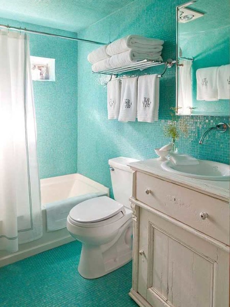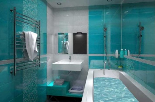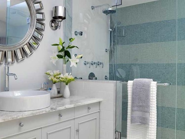 Дверцы в душ тоже можно сделать из цветного стекла в тон или поставить разделительные стенки для создания более уютной атмосферы