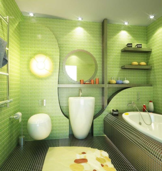 Чаще всего дизайн санузла разрабатывают с учетом того что стены будут выложены керамической плиткой. До не давнего времени конкурентов у этого материала не наблюдалось. Сегодня все более популярной становится мозаика. Это очень маленькая плитка (стеклянная или керамическая), наклеенная на полимерную сетку. Мелкие плитки обычно имеют несколько оттенков, что при дает стенам интересный вид и присутствует в большинстве современных интерьеров санузла.