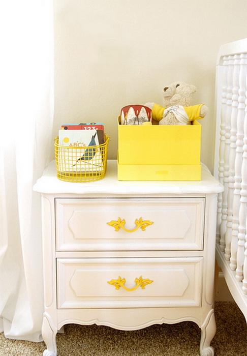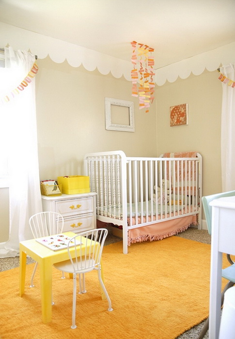 Фестоны на стене под потолком, жёлтые ручки на мебели, приятно оранжевый плед, жёлтые корзинки, яркие картинки на стенах, игрушки на полках — ребёнок всё это будет внимательно рассматривать и изучать.