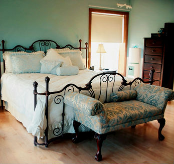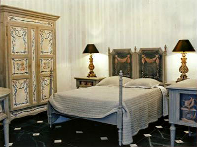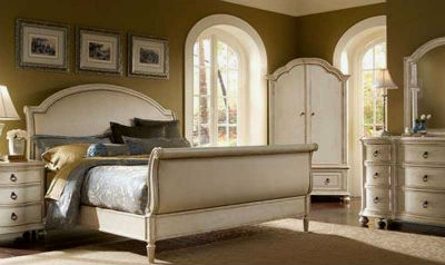 Лучше приобрести деревянную или металлическую мебель. Кровать может выглядеть слегка грубоватой или напротив изящной. В идеале, дизайн спальни Прованс будет великолепно смотреться именно с первым вариантом кровати (в грубоватом исполнении). Из мебели, в спальне можно установить кровать, две тумбочки, комод, туалетный столик и шкаф. Причем вся мебель может быть выполнена под старину или искусственно состаренная (трещины и потертости только приветствуются).