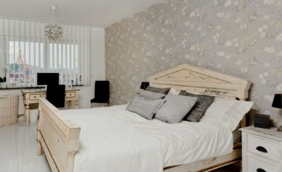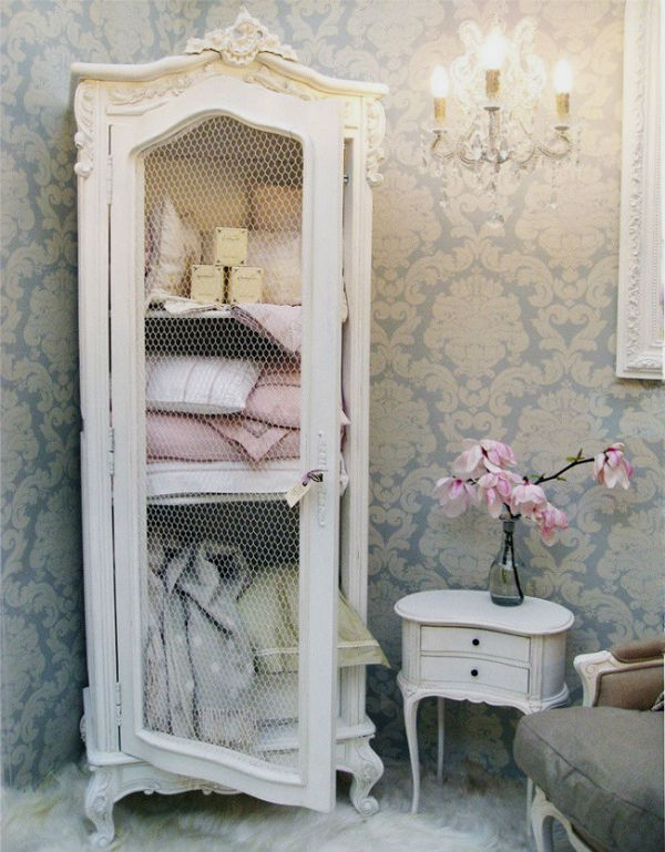 В случае с небольшим помещением спальни, лучше воздержаться от неконтролируемого использования украшающих элементов. Достаточно будет цветастых штор, покрывала, подушек с рюшами, настенного зеркала в кованой раме, двух светильников на тумбочки с тканевыми абажурами в цветочек и простого напольного ковра. Из мебели: кровать, две тумбочки, если в доме есть гардеробная комната — от шкафа лучше отказаться. Этого будет достаточно, иначе излишне захламленное пространство, будет казаться гораздо меньше своих параметров.