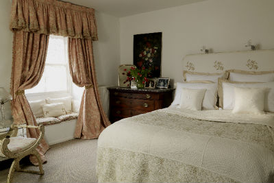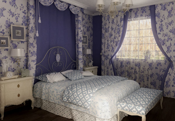 В такой спальне, просто великолепно будут смотреться шторы, пошитые из натуральных тканей: ситца, хлопка и традиционного льна. Одинаково прекрасно будут смотреться, как однотонные полотна, так с узорами или в мелкий цветочек. Гораздо реже, но все же используется материал в полоску или клетку. Кроме того, шторы могут быть украшены всевозможными рюшами или декоративными лентами.
