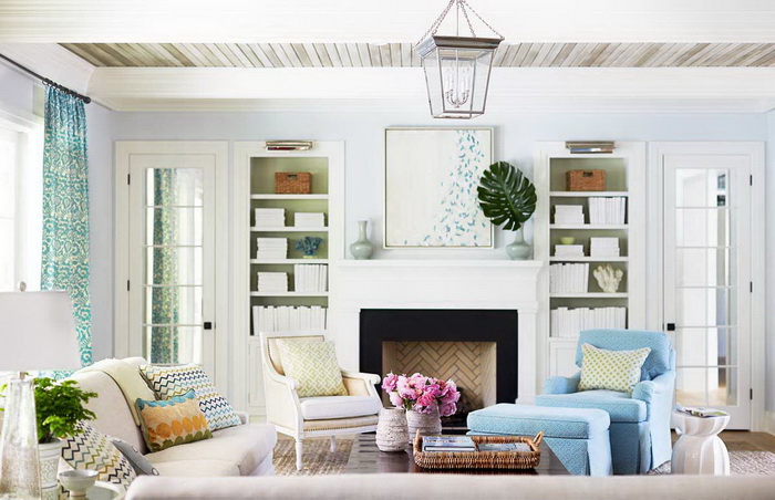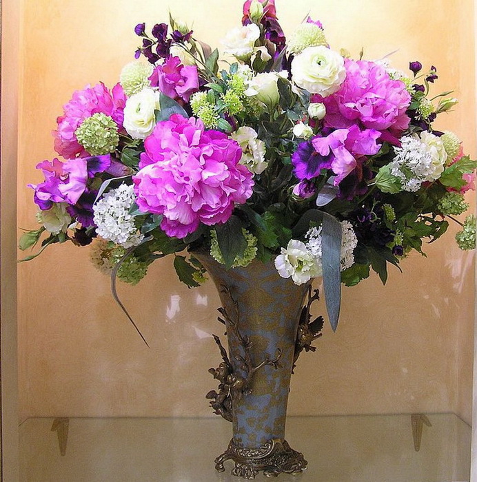 Для гостиных выбирают высокие букеты для напольных ваз, небольшие для каминных полок и, заметьте, даже для искусственных цветов прозрачные вазы и сосуды наполняют водой. Создаётся полная иллюзия живых букетов.