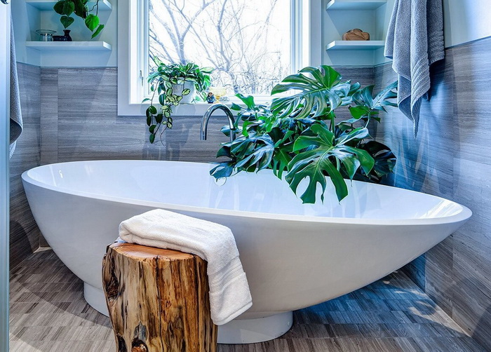 Небольшие букетики перед зеркалом в ванной или лопухи-листья тропических растений и Ваша ванная преобразилась. Так приятно видеть любимые тюльпаны на умывальной столешнице. (Давно хотелось поставить цветы в ванную комнату, но всегда не хватало там света, и было очень жалко растения).