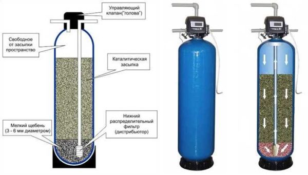 Находящаяся в каталитическом фильтре засыпка многократно ускоряет процесс окисления двухвалентного железа и выпадение его в осадок. В зависимости от засыпки, могут удалятся еще и примеси марганца, хлора, других растворенных в воде веществ, также в процессе очистки оседают на дно механические частицы. Удаление накопленных отложений происходит по заданному графику, обычно — в ночное время. Засыпка промывается под напором воды, все сливается в канализацию, на время промывки подача воды прекращается. Каталитические фильтры — сложное и недешевое оборудование, но они — самые долговечные из существующих.