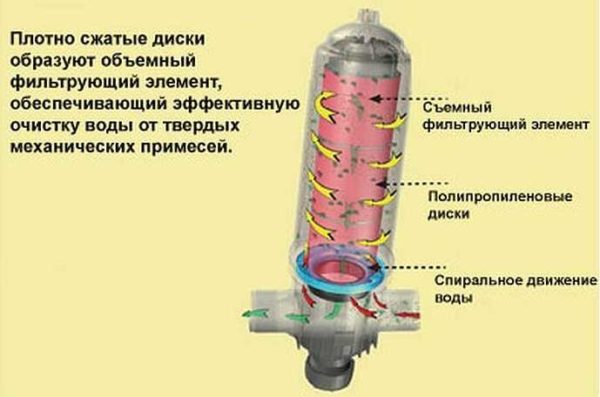 Фильтрующий элемент — набор полимерных дисков, на поверхности которых нанесены углубления-царапины разной глубины. Диски в собранном состоянии плотно прижаты друг к другу, вода проходит через ложбинки в дисках, на них при этом оседают частицы большего диаметра. Движение воды спиралеобразное, так что взвеси удаляются качественно.